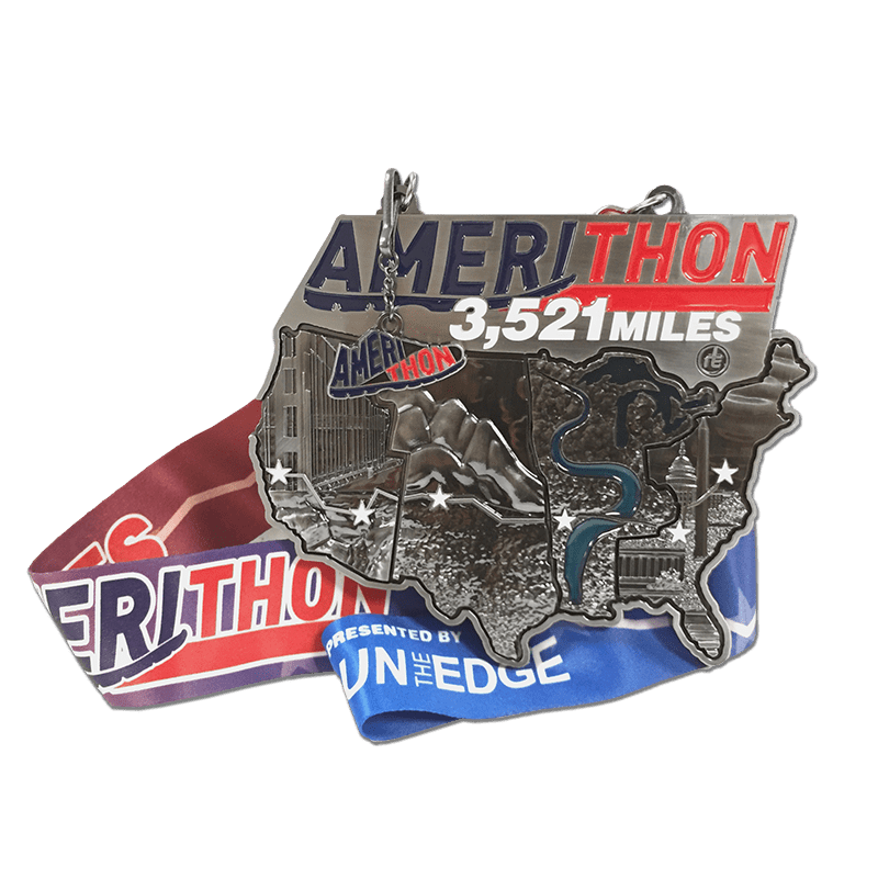 Step 6. Assemble your medal as you hit the key landmarks. The first 4 pieces of the medal are earned as you move across the country. Just before you reach the last landmark, you will fill out a form and we will ship you the finishing piece to the medal which doubles as a key chain!
