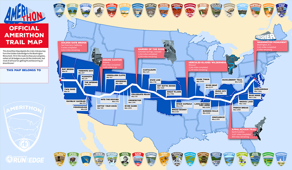 Step 4. Collect your swag. We will ship out your swag (for Deluxe and Get It All packages) during the first week of July. You will get the first 5 pieces of the medal in an awesome keepsake box. Hang the wall map up somewhere so you can see the course and mark your progress. Start filling in your Amerithon Passport with dates and badge stickers as you achieve them.